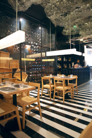No se debe ignorar la importancia de las ilustraciones que visten las paredes del restaurante, que son clave para aportar el ambiente divertido y desenfadado . Por último, es llamativo el detalle del techo , que simula el humo proveniente del fuego que invade la estética del local y, en especial, de la barra.